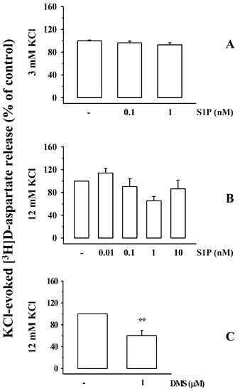 Effects of sphingosine-1-phosphate (S1P) and N,N-dimethylsphingosine on the spontaneous and KCl-evoked release of [3H]D-aspartate from mouse cortical synaptosomes. (A) Effect of S1P on the [3H]D-aspartate release under resting condition or (B) elicited by high (12 mM) KCl solution. (C) Effect of N,N-dimethylsphingosine (DMS) on the tritium release elicited by high (12 mM) KCl. Results are expressed as a percentage of the respective control. Data are means ± SEM of at least five experiments run in triplicate. ** p < 0.01 vs. 12 mM KCl-evoked tritium overflow.