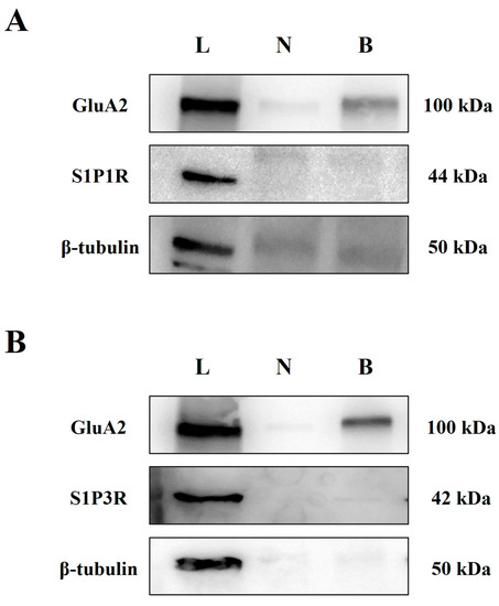 It has been proposed that S1PRs are expressed in plasma membranes under resting conditions and undergo rapid internalization upon activation with agonists. Biotinylation studies were carried out to verify the presence of S1P1R and S1P3R in the plasma membranes of cortical synaptosomes. Based on previous observations [34], the GluA2 subunit of the AMPA receptors was used as a positive control of the biotinylation process while the β-tubulin was used as a negative control. Based on expectations, GluA2 immunopositivity was detected in the total synaptosomal lysate as well as in the biotinylated fraction (Figure 6A,B), while β-tubulin immunopositivity was absent in the biotinylated samples but present in the synaptosomal lysates (Figure 6A,B). S1P1R and S1P3R immunostainings were detected in synaptosomal lysates but not in the biotinylated samples (Figure 6A,B, respectively).