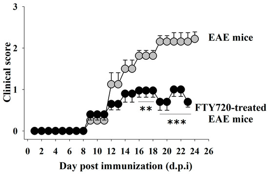 Impact of in vivo therapeutic FTY720 administration on the clinical score of mice with experimental autoimmune encephalomyelitis (EAE). The animal score was recorded daily in fingolimod (FTY720)-untreated (grey circles, n = 10) and FTY720-treated EAE mice (black circles, n = 10). FTY720 (0.03 mg/kg) (treatment started 11 ± 1 d.p.i., see arrow). The daily clinical score is reported as mean ± SEM; ** p < 0.01 vs. FTY720-untreated EAE mice; *** p < 0.001 vs. FTY720-untreated EAE mice.
