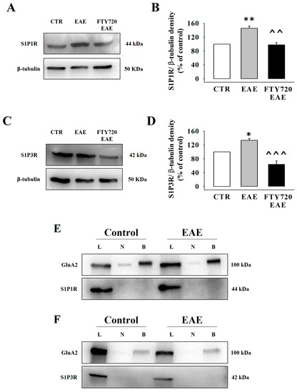 In this context, besides highlighting the possible biochemical and functional changes of S1P1Rs and S1P3Rs in cortical EAE synaptosomes, the study aimed to evaluate the impact of the administration of therapeutic FTY720 on these receptors and their efficiency in controlling glutamate exocytosis. The working hypothesis is based on evidence in the literature demonstrating that the compound recovers central glutamatergic derangements [6,16,17] and modulates the expression of S1PR mRNA [48,49] in these mice.