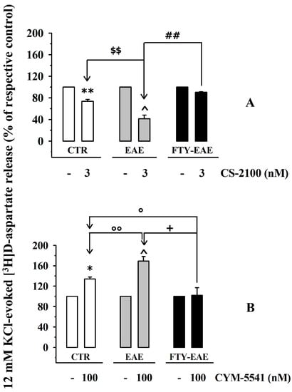 Finally, we quantified the impact of CS-2100 (3 nM, Figure 9A) and CYM-5541 (100 nM, Figure 9B) on the 12 mM KCl-evoked release of [3H]D-aspartate from cortical synaptosomes of control, FTY720-untreated EAE mice, and FTY720-treated EAE mice.