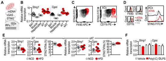 (A) Scheme summarizing the role of cGAS/STING in recognition of mitochondrial DNA (mtDNA) in the cytosol. (B) Transcript level of Sting1 and Cgas in BAT, skeletal muscle, hepatocytes, iAT and eAT of male C57/BL6 mice at 8 weeks of age. Each data point represents one biological replicate. (C) FACS plot representing STING expression level of adipocytes (ACs) and adipose tissue macrophages (ATMs) of male C57/BL6 mice at 8 weeks of age. Extended analysis is presented in [24]. (D) Histograms comparing STING levels of ACs and ATMs. Iso: isotype control. Extended analysis in [24]. (E) Transcript levels of Sting1 and Cgas in iAT and eAT of normal chow-diet (NCD)-fed or high-fat diet (HFD)-fed male C57/BL6 mice. Prevalence of STING+ ATMs in iAT and eAT, expressed as the percentage of the total ATM population. Extended analysis presented in [24]. Each data point represents one biological replicate. (F) Level of Sting1 and Cgas mRNA in mouse adipocytes cultured in vitro and treated with 10 ng/mL poly(I:C) (a TLR3 ligand) or 100 ng/mL LPS (a TLR4 ligand) for 18 h.