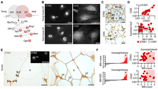 Expression of STING and cGAS mRNA and protein in adipocytes. (A) Venn diagram summarizing the number of equally and differently expressed mRNA transcripts of young and adult mouse iAT. A gene network associated with Sting1 was equally expressed by young and adult iAT. A protein–protein interaction map, generated by STRING [30] is shown below the Venn diagram. Extended analysis presented in [24]. (B) Immunofluorescence of in vitro cultured adipocytes from young and adult mouse iAT; nc: nucleus, scale bar 20 μm. (C) Immunostaining of STING and cGAS proteins in the iAT of young mice, showing a region containing both multilocular and unilocular adipocytes. Arrowheads label nuclei; lp: lipid droplet; cyt: cytoplasm; scale bar: 50 μm. (D) Top: Expression of STING1 and CGAS mRNA in human inguinal and abdominal adipose tissue specimens. Linear regression analysis indicates a significant positive correlation between STING1 and CGAS mRNA levels. Each data point represents one tissue donor patient. Bottom: Correlation of donor age and the adipose tissue expression levels of STING1 and CGAS. (E) Immunohistochemistry of STING and cGAS proteins in human adipose tissue, collected from the inguinal-low abdominal region. Nineteen-month-old male infant; arrowheads label nuclei; lp: lipid droplet; cyt: cytoplasm; scale bar: 25 μm. Inlet shows nuclear STING labeling of an in vitro cultured human adipocyte. Scale bar: 20 μm. (F) Body mass index z-score (BMI z-score) and BMI standard deviation score (BMI-SDS) of adipose tissue donors involved in this study. Correlation of BMI z-score with adipose tissue STING1 and CGAS mRNA levels.