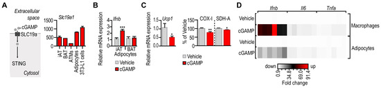 Response of mouse adipocytes and macrophages to a STING ligand. (A) Left: Uptake route of the STING ligand 2′3′-cyclic-AMP-GMP (cGAMP). Membrane transport of cGAMP is facilitated by the solute carrier protein SLC19a. Right: Expression of Slc19a1 mRNA in mouse iAT, BAT, ATMs, primary adipocytes and in mouse 3T3-L1 cells. Secondary NGS analysis from [29]. (B) Ifnb expression level in iAT- and BAT-derived adipocytes, treated in vitro with 10 µg/mL cGAMP for 18 h. (C) Expression of Ucp1 mRNA and the activity of mitochondrial enzymes COX-I and SDH-A in mouse iAT-derived adipocytes treated with cGAMP for 18 h. (D) Heat map summarizing the transcriptional changes of Ifnb, Il6 and Tnfa in mouse macrophages and adipocytes, following treatment with 10 µg/mL cGAMP for 18 h. * p < 0.05, ** p < 0.01, *** p < 0.001, Student’s unpaired 2-tailed t-test.