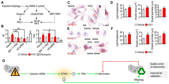 Effect of STING inhibition on the inflammatory state and lipid accumulation of adipocytes. (A) Scheme of cytosolic DNA sensor pathways that respond to mitochondrial DNA (mtDNA). (B) Expression levels of Tnfa and Il6 mRNA in mouse adipocytes treated with vehicle or 0.5 μM H151 for 18 h. Cytosolic DNA sensors pathways were blocked by the NFκB inhibitor BAY 11-70082, or by transfecting cells with an Irf3-siRNA. As a comparison, adipocytes were treated with vehicle or 100 μM chloroquine for 18 h. (C) Oil red O labeling of lipid droplets in mouse preadipocytes, treated with vehicle or H151 for 18 h. Scale bar: 20 μm. (D) Number, area and perimeter of lipid droplets following treatment with vehicle or H151 for 6 h. (E) Oil red O labeling of lipid droplets in human preadipocytes, treated with vehicle or H151 for 18 h. Scale bar: 20 μm. (F) Number, area and perimeter of lipid droplets in human preadipocytes following treatment with vehicle or H151 for 6 h. * p < 0.05, ** p < 0.01, Student’s unpaired 2-tailed t-test; # p < 0.05, ### p < 0.001, one-way ANOVA with Dunnett’s post hoc test. (G) Working model summarizing the dual roles of STING in adipocytes. STING activation promotes expression of interferons (IFNs) and causes inflammation. In turn, an anti-inflammatory effect of STING exists in adipocytes by increasing autophagic removal of inflammation-provoking mitochondrial contents. Also, STING appears to control lipid content in adipocytes.