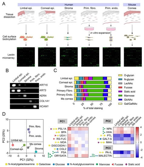 Cell surface glycan profiles of human and mouse corneas as determined by lectin microarray. (A) Schematic representation of the workflow used for lectin microarray analysis. (B) PCR detection of cell type-specific markers in RNA extracted from limbal epithelium, corneal epithelium, stroma, primary fibroblasts, and primary endothelial cells. (C) Relative staining of different groups of lectins classified according to carbohydrate specificity (from Supplementary Table S1). The fluorescence intensity of each lectin in the microarray was normalized within each sample and expressed as percentage of total intensity. (D) Score plot for principal component 1 (PC1) and 2 (PC2) from the principal component analysis of 65 lectins showing positive fluorescence intensity after quantile normalization. The heatmap shows log2 normalized intensity values from lectins with a coefficient of variation higher than 30% and loading values for PC1, PC2, and PC3 > 0.80 or <−0.80. The symbols indicate the glycan structures recognized by each lectin.