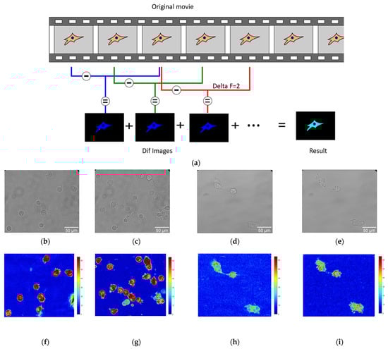 The application of the ONMD method to cell study. (a) Scheme of processing the movies using the ONMD algorithm. Every single frame is subtracted from the frame located deltaF frames later (in this case deltaF = 2). The absolute value of the obtained images (Dif images) is summed and produces the final false-color image (Result). The brighter it is, the more pixels change their value during the recording. (b–e) The optical images of suspended BT-20 cells (b,c) and adherent ZR-75 cells (d,e). (f–i) Corresponding to optical images (b–e), the false-color images of the number of pixels that changed their intensity between frames for suspended BT-20 cells (f,g) and adherent ZR-75 cells (h,i) (same magnification as the corresponding optical images (b–e)).