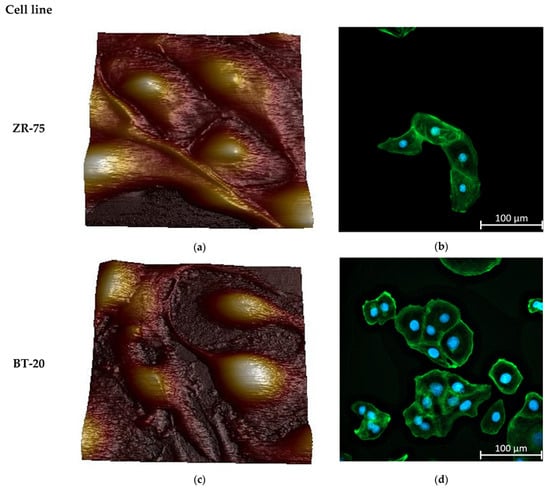 Atomic force microscope Bruker BioScope Resolve (Bruker, Billerica, MA, USA) was used to study the mechanical and structural properties of the cell surface. In our experiments, we operated AFM in two modes: PeakForce Quantitative Nanomechanical Mapping (PF QNM) mode and Force Volume (FV) mode. Scanning in air was performed using a SCANASYST-AIR probe (Bruker, Camarillo, CA, USA, k = 0.4 N/m, R = 2 nm) in MIROview PF QNM mode. Whole cells were scanned with the scan size of 100 µm × 100 µm and a resolution of 512 × 512 pixels. The small areas of the cell surface (1 μm × 1 μm, 256 × 256 pixels) were scanned over the cell nuclear zones. The scan rate was 0.3 Hz, and the Peak Force Setpoint was 290 pN. To study the properties of live cells in liquid mode, the PF QNM in fluid mode, and FV in fluid mode were applied at 37 °C. The silicon tip with a nitride coating on a SCANASYST-FLUID (Bruker, Camarillo, CA, USA) cantilever was used (k = 0.7 N/m, R = 20 nm) for PF QNM in fluid. The scanning parameters were as follows: the scan size was 100 μm × 100 μm, resolution was 512 × 512 pixels, Peak Setpoint was 5 nN (for BT-20 cells) and 3.2–4.7 nN (for some experiments, 435 pN) (for ZR-75 cells). When FV was applied, a pre-calibrated silicone probe PFQNM-LC-A-CAL (Bruker, Camarillo, CA, USA) (k = 0.1 N/m, R = 70 nm) was used. The scanning parameters were as follows: scan size was 10 μm × 10 μm, the rate was 8.14 μm/s, and the trigger force threshold was 1 nN. The SCANASYST-AIR and SCANASYST-FLUID probes were calibrated before scanning the cell samples using the Touch mode, and the pre-calibrated PFQNM-LC-A-CAL probe was calibrated using the No-Touch mode.