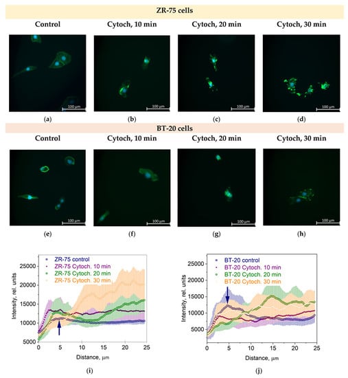 The actin cytoskeleton of BT-20 cancer cells is highly sensitive to the cytochalasin D. The effect of this potent inhibitor of actin polymerization and actin cytoskeleton structure disturber is quicker than its effect on the actin cytoskeleton of ZR-75 cells (Figure 3a–h). So, the F-actin density peak in the cortex disappears at 20 min after cytochalasin D is added to BT-20 cancer cells. For ZR-75 cancer cells, this peak is visible up to 30 min incubation time with cytochalasin D (Figure 3i,j).