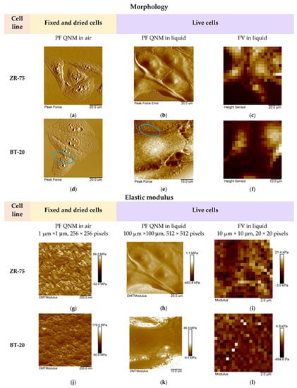 Representative AFM images of the studied breast cancer cells recorded using three AFM modes. (a–f) The AFM images (PeakForce, PeakForce Error, and Height) obtained using different AFM modes and representing the studied cell morphology. Blue ovals show the microvilli of BT-20 cells observed in the AFM images recorded using PF QNM mode in air and liquid. The size of the images recorded using FV mode was 10 μm × 10 μm. (g−l) The maps of the elastic modulus (DMT modulus and Young’s modulus) of the studied cells obtained using different AFM modes.