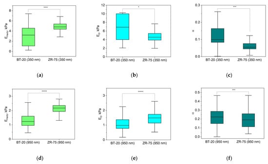 Elastic and viscoelastic parameters of BT-20 and ZR-75 cells. EHertz (a,d) is Young’s modulus isolated from the force–distance curves of FV data based on Hertz’s theory. The viscoelastic parameters (the instantaneous elastic modulus, E0 (b,e), and the power law exponent, α (c,f)) were extracted from force–distance curves of FV data based on the PLR theory. The parameters were measured at the indentation depth of 350 nm (376(333;393) nm for BT-20 cells and 356(331;377) nm for ZR-75 cells) and 950 nm (949(925;975) nm for BT-20 cells and 944(923;973) nm for ZR-75 cells). Data are presented as Me(LQ; UQ). * p < 0.05, *** p < 0.001, **** p < 0.0001, ***** p < 0.00001, Mann–Whitney U test.