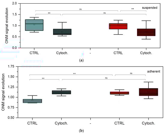 Control value was obtained by averaging the nanomotion amplitude of every single cell between 0 and 30 min before the addition of cytochalasin D. The cytochalasin D data correspond to the averaged nanomotion amplitude of single cells between 0 and 30 min after cytochalasin D injection. The effects of cytochalasin D are significant in the BT-20 cell nanomotion, showing a decrease in the nanomotion parameters for the cell suspended state and their increase for its adherent state. In the case of ZR-75 cells in a suspension, significant differences are also observed. However, for ZR-75 cells in the adherent state, no detectable modification occurs after cytochalasin D injection, except for higher variation in the values following the effects of the drugs. However, the nanomotion parameter of ZR-75 cells in the adherent state is significantly higher than that of the BT-20 cells in the absence of the drug. In the control experiments, no significant difference was found between the suspended and adherent states for any of the cell lines in terms of ONM evolution (p > 0.05, Mann–Whitney U test).