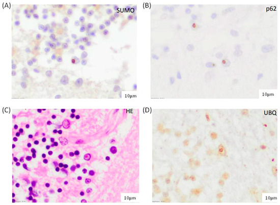 Having shown that SUMO2/3 and p62 are within the highly abundant proteins in FXTAS inclusions [11] and that they have a role in cellular strategies of protein quality control [28,31], this study aimed to characterize SUMOylation and autophagy pathways in FXTAS patients. Firstly, SUMO2/3 distribution was examined by immunohistochemistry in the postmortem prefrontal cortex, hippocampus, and cerebellar vermis of FXTAS patients and controls. Similar to those previously described, results showed that SUMO2/3 stained within inclusions, as SUMO2/3 immunoreactivity overlapped with p62 and ubiquitin staining (Figure 1). However, when quantifying SUMO2/3 by western blot in total brain lysates from FXTAS patients and controls, and in consonance with previous reports, no differences were obtained. This may be due to the low intranuclear inclusions in our cases and, on the other hand, to the use of total brain lysates, which do not differentiate cellular types or cellular compartments. These results reinforce the idea that SUMO2/3 conjugates may get diluted in whole tissue lysates, as previously pointed out [11]. No statistically significant differences between FXTAS patients and controls were obtained when quantifying SUMO2/3 in whole lysates from skin fibroblasts (p > 0.05).