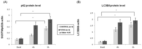 Nevertheless, after bafilomycin A1 cells treatment, which blocks autophagosome degradation and thus allows the measurement of autophagosome synthesis, a gradual and significant increase was found between basal condition and 8 h bafilomycin A1 treatment for p62 protein levels (p = 0.04 for controls; p = 0.02 for FXTAS patients) (Figure 2A). Although this increment was found in both groups, when comparing the fold change between different experiment conditions, FXTAS patients consistently showed a 30% higher increase of p62 than controls. On the other hand, when analyzing LC3BII results, despite there was also a significant increase of LC3BII levels between basal condition and 8 h (p = 0.01 for controls; p = 0.007 for FXTAS patients), the FXTAS group presented a 20% higher increase than control when comparing fold change between basal condition and 4 h treatment (Figure 2B). The same comparison at 8 h treatment did not show differences in FXTAS patients, indicating that at 8 h of bafilomycin A1 treatment, the autophagic flux may have reached a plateau. Overall, these results suggest that skin fibroblasts from FXTAS patients are accumulating autophagic cargo (p62 labeling) in a higher proportion than control cells and that the autophagic flux is enhanced, probably to mediate the degradation of damaged cell organelles and proteins. Nevertheless, it cannot fully be discarded that the enhanced autophagic flux is a consequence of a primary alteration of the process per se.