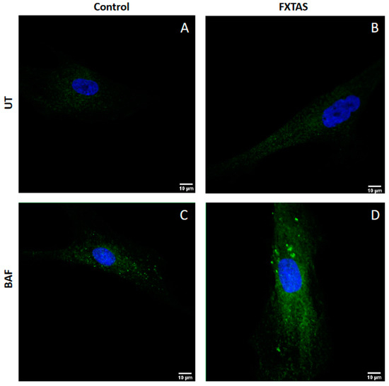 Visualization of autophagosomes. Representative images of autophagosome formation in untreated fibroblast (UT) and 6 h treatment with 100 nM bafilomycin fibroblast (BAF) obtained by confocal microscopy (63×). (A) Untreated fibroblast from control individuals. (B) Untreated fibroblast from FXTAS patients. (C) 6 h treatment fibroblast from control individuals. (D) 6 h treatment fibroblast from FXTAS patients.