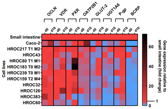 The effects of the ten-day post-confluence (d10) state on intestine-specific gene expression are shown in Figure 1. Confluence-dependent increases in OCLN, VDR, PXR, OATP2B1, glucose transporter 2 (GLUT-2), UGT1A6, and P-gp mRNAs were most pronounced in HROC60, HROC80 T1 M1, and HROC183 T0 M2. Genes were stably expressed in HROC217 T1 M2, and with the exception of GLUT-2, confluence-dependent changes were also observed for this line. The least effects were observed for HROC60 and HROC383 with expression levels staying distinctly below the small intestinal expression. In HROC43, the VDR, OATP2B1, UGT1A6, and BCRP mRNAs were more highly expressed in the control group than in the post-confluence state. UGT1A6 was barely expressed in HROC126 and absent in HROC383. A high up-regulation of PXR mRNA was observed in HROC183 T0 M2 (73-fold) and HROC80 T1 M1 (52-fold) at d10 post-confluence. OCLN and OATP2B1 were overexpressed in Caco-2 cells in the post-confluence state (25- and 36-fold change). HROC32, HROC126, and Caco-2 lacked sufficient BCRP expression.