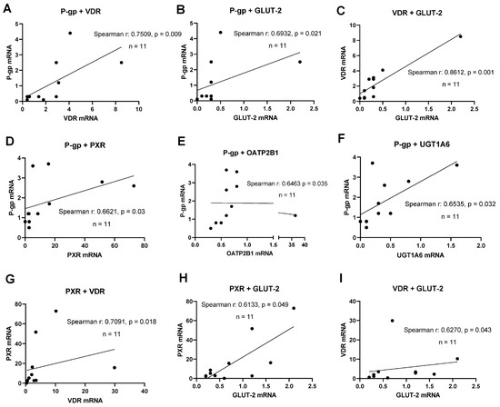 A key aspect of novel human intestinal in vitro models’ characterization was the detection of relevant transporter and nuclear receptor expression. A correlation analysis was performed to examine the simultaneous expression of relevant DTs and NRs to deliver evidence for functional gene–gene interaction networks active in these lines. PXR mRNA expression significantly correlated with VDR mRNA (r = 0.709, p = 0.018) and GLUT-2 mRNA (r = 0.613, p = 0.049, shown in Figure 2). The expression of P-gp mRNA correlated with the mRNAs of PXR (r = 0.662, p = 0.03), OATP2B1 (r = 0.646, p = 0.035), and UGT1A6 (r = 0.654, p = 0.032). Further, a significant correlation was found for VDR and GLUT-2 mRNAs (r = 0.627, p = 0.043) at d10 post-confluence. In summary, significant correlations between the expression of selected transporters and NRs were more abundant with an increase in culture time.