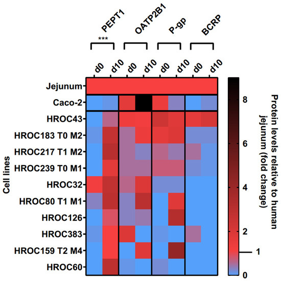 Time-dependent protein expression levels of drug transporters in HROC and Caco-2 cells. Cells were cultured on 6-well plates and then grown until reaching confluence. Protein levels detected by LC-MS/MS were calculated as fold changes relative to human jejunal tissue. Reference tissue was set at 1.0. *** p < 0.001 by paired Student’s t-test.