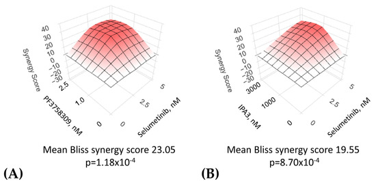 Examples of synergistic suppression of uveal melanoma cells via combinations of PAK inhibitors and a MEK inhibitor, selumetinib. Mel202 uveal melanoma cells [115] (a gift from Dr. Harbour, University of Texas Southwestern) were exposed to a range of doses of selumetinib in combination with various doses of PAK inhibitors PF3758309 (A) or IPA3 (B). After 5 days of treatment, the numbers of remaining cells were compared using methylene blue staining and an extraction method as described earlier [116], and drug synergy according to the Bliss synergy model was analyzed using SynegyFinder software (version #: 6.04.2023-R-3.6.3-dev) [117].