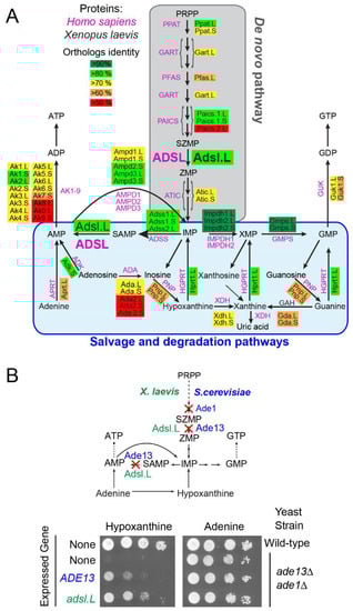 To establish that the putative X. laevis purine pathway genes encode the predicted enzymatic activities, a functional complementation assay was undertaken via heterologous expression of X. laevis genes in the yeast Saccharomyces cerevisiae, which was shown to be a valuable model to investigate metabolic pathways []. Yeast knockout mutants were available in the laboratory and sequence alignments showed a high degree of identity between S. cerevisiae and X. laevis orthologous protein sequences (Figure S1 and Table S7). Plasmids allowing for expression of the X. laevis ORF in S. cerevisiae were transformed in the cognate yeast knockout mutant, and functional complementation was tested. As shown in Figure 1B, the yeast adsl knockout mutant (ade13) was unable to grow in the presence of hypoxanthine as a unique purine source, but growth was restored by the expression of either the S. cerevisiae ADE13 or the X. laevis adsl.L gene. By contrast, all these strains were able to grow in the presence of adenine, which allowed for purine synthesis via the adenine phosphoribosyl transferase (Apt1) and AMP deaminase (Amd1) activities (Figure S1). Similar experiments were conducted with 15 other X. laevis purine-pathway-encoding genes, 13 of which were able to complement the S. cerevisiae cognate knockout mutants (Figures S4 and S5). Altogether, this data allowed us to functionally validate adsl.L and 13 other X. laevis genes involved in purine de novo and recycling pathways, demonstrating that the purine pathways were functionally conserved in X. laevis.
