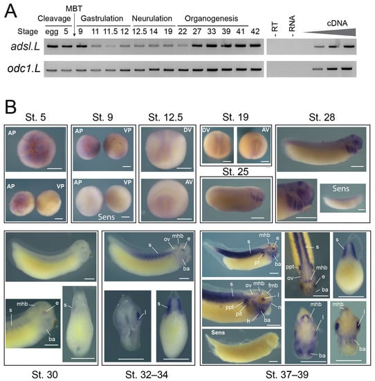 Spatiotemporal expression of adsl.L gene during X. laevis embryonic development. (A) Temporal expression profiles of adsl.L gene during embryogenesis. The expression profile was determined using RT-PCR from the cDNA of the fertilized oocyte (egg) and whole embryo at indicated stages covering the different phases of X. laevis embryogenesis. The ornithine decarboxylase gene odc1.L was used as a loading control and negative controls were performed by omitting either reverse transcriptase (-RT) or RNA (-RNA) in the reaction mix. Linearity was determined via dilutions of cDNA from stage 39 for adsl.L and 41 for odc1.L. Mid-blastula transition (MBT) is indicated. (B) Spatial expression profile of adsl.L gene during embryogenesis. Whole-mount in situ hybridization with adsl.L-specific DIG-labeled antisense or sense RNA probes was performed on embryos from stages (St.) 5 to 37–39. St. 5 and 9: animal (AP) and vegetal (VP) pole views, St. 12.5 and 19: dorsal (DV) and anterior (AV) views; later stages: lateral views, with dorsal up and anterior on the right, and dorsal view at stages 37–39. Transverse sections are dorsal up. Abbreviations: ba, branchial arches; e, eye; fmb, forebrain–midbrain boundary; h, heart; l, lens; mhb, midbrain–hindbrain boundary; n: nasal placode; ov, otic vesicle; ppt, pronephric proximal tubules; pit, pronephric intermediate tubules; s, somites. Bars: 0.5 mm.