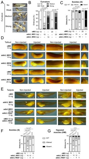 The adsl.L gene is required for somites and hypaxial muscle formation in X. laevis. (A) Representative images of adsl.L morphants following adsl.L MO1 injection at either 10 ng (weak and medium curvature) or 20 ng (medium and strong curvature). (B) Quantification and statistics of the curvature phenotype. (C–G) Immunostaining with the differentiated muscle-cell-specific 12-101 antibody revealed a strong alteration of somites and hypaxial muscle formation in adsl.L knockdown and adsl.L overexpressing embryos. Representative images (D,E) and quantification and statistics (C,F,G) of somites and hypaxial muscles phenotype at tailbud (C,D) and tadpole (E–G) stages. Injected side is indicated by asterisks. S, somites; HM, hypaxial muscles. Bars: 0.5 mm. White and red arrowheads point to typical somite chevron shapes and altered somites, respectively. The adsl.L RNA* refers to mutated RNA whose translation was not affected by the adsl.L specific MOs (Figure S3). Numbers above the bars of histograms correspond to p-values.