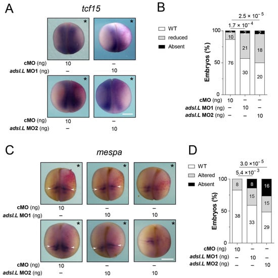 The adsl.L gene is required for the expression of tcf15 and mespa genes involved in early somitogenesis. Expression of tcf15 (A,B) and mespa (C,D) genes at late neurula stage is altered by the knockdown of adsl.L gene. Representative images of trf15 (A) and mespa (C) RNA expression revealed via in situ hybridization. Statistics are shown in (B) and (D) for trf15 and mespa RNA, respectively. White arrows point to the anterior domain of the somitomere S-II on both sides of the embryos. Injected side is indicated by asterisks. Numbers above the bars of histograms correspond to p-values. Bars: 0.5 mm.