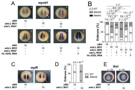 Expression of the myogenic regulatory factors myod1 and myf5 in paraxial mesoderm was strongly affected by the knockdown of the adsl.L gene. (A) Expression of myod1 gene at the early neurula stage was altered by the knockdown of adsl.L gene and rescued by adsl.L RNA* and human ADSL RNA. (C) Representative images of the effect on myf5 RNA expression by adsl.L knockdown at stage 12.5 revealed via in situ hybridization. (B,D) Quantification and statistics of the myod1 and myf5 expression phenotypes are presented in (A,C), respectively. (E) Knockdown of adsl.L did not alter the mesoderm formation, as revealed by the absence of change in tbxt (xbra) RNA expression domain at stage 11. Injected side is indicated by asterisks. The amounts of MO and RNA presented in this figure are in ng. Bars: 0.5 mm. Numbers above the bars of histograms correspond to p-values. White arrows point to the domain where expression of either myod1 or myf5 is altered.