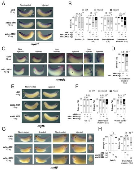 Knockdown of adsl.L gene caused an impaired expression of myod1 and myf5 at late tailbud and tadpole embryonic stages, leading to somites and craniofacial muscle formation defects. (A–D) Representative images of the adsl.L-dependent altered expression of myod1 (A) and myf5 (C) domains in either somite (S), dorsal somite border (DB), ventral somite border (VB) or craniofacial muscles (CM), as revealed via in situ hybridization in late tailbud embryos. Blue, red, green and purple arrowheads point to myod1 altered expression in somites, ventral border, craniofacial muscles and hypaxial muscles, respectively. (E,G) Representative images of the adsl.L-dependent altered expression of myod1 (E) and myf5 (G) domains in the unsegmented mesoderm in the most posterior tail (T), somites (S), ventral somite border (VB) and craniofacial muscles (CM) in tadpole embryos. Black and pink arrowheads point to myf5 altered expression in pharyngeal arch muscle enlagen intermandibularis muscle enlagen respectively. (B,D,F,H) Quantification and statistics of the myod1 and myf5 expression phenotypes presented in (A,C,E,G), respectively. Craniofacial muscles: ih, interhyoïedus anlage; im, intermandibularis anlage; lm, levatores mandibulae anlage; pam, pharyngeal archmuscle anlagen; q/oh, common orbitohyoïdeus and quadrato-hyoangularis precursors. Injected side is indicated by asterisks. Bars: 0.5 mm. Numbers above the bars of histograms correspond to p-values.
