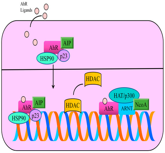 In the inactive state, AhR is primarily located in the cytoplasm and exists as a multi-protein complex with two chaperone proteins, HSP90 (heat shock protein 90) and co-chaperone p23. Moreover, AIP (AhR interacting protein) is a conserved co-chaperone protein that binds to many proteins, including AhR and HSP90. AhR ligands cross the plasma membrane and bind to AhR. These interactions allow the transportation of ligand-receptor complexes into the nucleus. ARNT (AhR nuclear translocator) is a basic Helix-Loop-Helix Motif containing transcriptional factor. Therefore, after accumulation of AhR in the nucleus, AhR forms heterodimers with its partner ARNT. Functionally active heterodimers bind specific DNA regions located in the promoter regions of different genes. AhR works with wide variety of co-factors and chromatin remodeling machinery. The steroid receptor co-activator (SRC) family of p160 proteins consists of SRC-1 (NcoA-1), SRC-2 and SRC-3. AhR/ARNT complex promoted the recruitment of SRC family of transcriptional co-activators. Histone deacetylases (HDACs) are displaced by AhR and histone acetyltransferases are recruited by AhR to stimulate transcriptional gene networks.