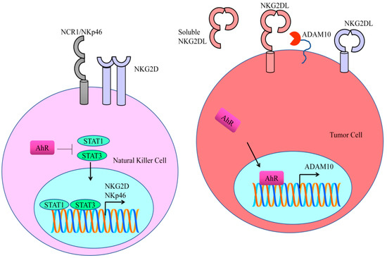 AhR stimulated transcriptional activation of ADAM10. ADAM10-specific inhibitors efficiently reduced the shedding of NKG2DL and enhanced its binding to NKG2D receptors. STAT proteins directly bind to the promoter regions of NK receptors (NKG2D and NKp46). Treatment with STAT inhibitors resulted in a decline in the expression of NKG2D and NKp46.
