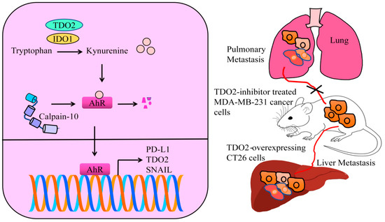 A liver metastasis model was generated by the injection of TDO2-expressing CT26 cells into the spleen of Balb/c syngenic mice. There was an evidence increase in the liver metastasis in mice injected with TDO2-overexpressing CT26 cells. AhR inactivation with a specific inhibitor (CH-223191) caused a complete blockade of the TDO2-mediated increase in hepatic metastasis. AhR has been shown to transcriptionally upregulate PD-L1 and TDO2. Activation of the kynurenine-AhR cascade by TDO2 induced the activation of PD-L1 and TDO2 in colon cancer cells. Knockout of PD-L1 almost completely impaired the TDO2-induced increase in hepatic metastasis. TDO2-induced liver metastasis was also reported to be abrogated by the intraperitoneal injections of neutralizing anti-PD-L1 antibodies [28].