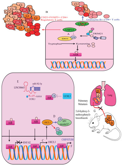 In 2004, Ciechanover, Hershko and Rose won the Nobel Prize (Chemistry) in recognition of their ground-breaking discoveries, which unraveled novel mechanisms associated with ubiquitin-directed degradation of substrates [46,47,48,49,50,51]. The fate of the ubiquitinated proteins, however, can be reversed through the action of deubiquitinases [52,53,54,55]. In this section, we have selected key findings for discussion related to regulation of ubiquitin ligases by AhR in different cancers. Moreover, we have also highlighted how AhR interacted with different ubiquitin ligases and deubiquitinating enzymes for regulation of signaling pathways.