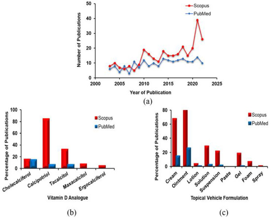 The data obtained from the literature search were imported into EndNote 20 for organization and management. To determine the eligibility of the articles, two reviewers independently assessed the titles, abstracts, and full texts. A total of 327 articles were found on Scopus and 188 articles on PubMed, as shown in (Figure 3a). Both search engines yielded a similar distribution of articles. The included articles were evaluated based on the vitamin D analogues and types of topical vehicle formulation, as depicted in (Figure 3d,c). The titles and abstracts of the articles were screened for relevance, resulting in a total of 83 publications. These publications underwent a detailed review, and ultimately 27 studies were selected and summarized in (Table 1).
