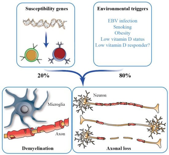 MS and vitamin D. MS is a complex autoimmune disorder, the onset of which is triggered by a combination of genetic (with estimated contribution 20%) and environmental factors (with estimated contribution 80%). MS is characterized by inflammatory, demyelinating lesions in the CNS leading to heterogeneous axonal loss.