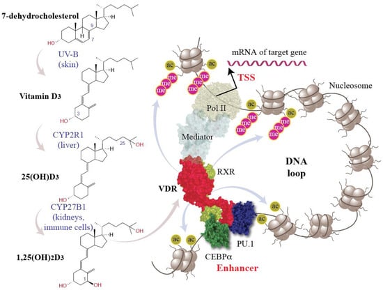 Principles of vitamin D signaling. 7-dehydrolesterol is a direct precursor of cholesterol but under exposure with UV-B can also convert into vitamin D3 (left). CYP2R1 (cytochrome P450 family 2 subfamily R member 1) hydroxylates vitamin D3 into 25(OH)D3 (25-hydroxyvitamin D3) and CYP27B1 adds a further hydroxy group to C1. 1,25(OH)2D3 is a nuclear hormone that activates VDR (red). The pioneer transcription factors PU.1 (purine-rich box 1, dark blue) and CEBPα (CCAAT enhancer binding protein α, green) support the DNA binding of VDR-RXR (retinoid X receptor, light green) heterodimers. VDR-bound enhancers activate via DNA looping and the Mediator complex Pol II (RNA polymerase II) waiting on the TSS (transcription start site) region of a vitamin D target gene. This finally changes the expression of hundreds of vitamin D target genes (top right), a number of which are involved in the regulation of the immune system and have an impact on MS (Section 4).