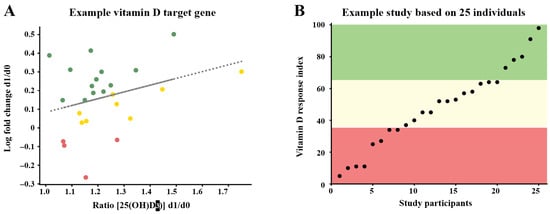 Since there is significant genetic and epigenetic variation between human individuals [], recommendations for vitamin D3 supplementation for the whole population may not be suited best for everyone. The concept of the vitamin D response index was developed on the basis of the vitamin D intervention studies VitDmet (NCT01479933, ClinicalTrials.gov (accessed on 14 June 2023)) [,,,] and VitDbol (NCT02063334) [,], which were designed more as a medical experiment than an RCT. In the VitDmet study, 71 elderly pre-diabetic individuals were supplemented daily with either 0, 40, or 80 µg vitamin D3 over 5 months during winter in Finland. Blood samples were collected at the beginning and end of the intervention. In contrast, the VitDbol study used 35 young healthy individuals, who obtained a single bolus of 80,000 IU vitamin D3. Samples were gathered at days 0, 1, 2, and 30. PBMCs (peripheral blood mononuclear cells) were isolated, and RNA was prepared without any further in vitro culture. The supplemented vitamin D3 is endogenously converted to 25(OH)D3 and 1,25(OH)2D3, which results in changes of gene expression being measured by qPCR (quantitative polymerase chain reaction) or RNA-seq (RNA sequencing). Thus, the interventions represent safe human in vivo experiments.