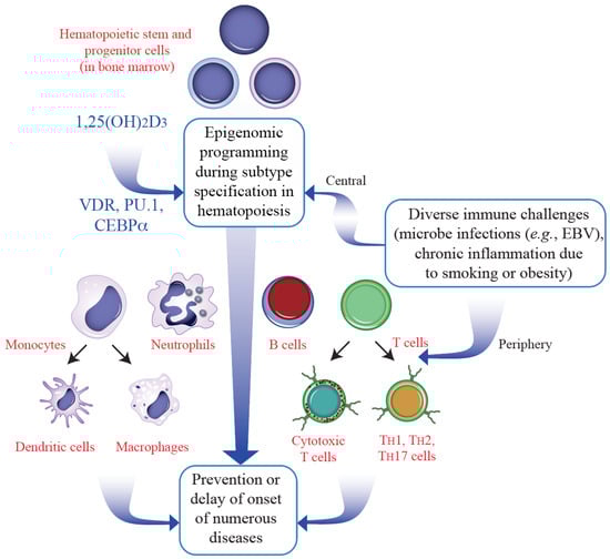 Hematopoiesis generates out of stem cell in the bone marrow more than 100 different cell types of the immune system and the blood. This involves epigenetic programming of terminally differentiated cells and creates a dominant form of epigenetic memory. Together with PU.1 and CEBPα VDR acts as a key regulator of myeloid line of hematopoiesis generating innate cells like granulocytes and monocytes [] (Figure 5). Since most immune cell types have a rapid turnover, they can respond more flexibly to environmental changes than other tissues. Perturbations like antigen encounter and DAMPs (danger associated molecular patterns) exposure induce signal transduction cascades, the end of which are chromatin modifiers and transcription factors. This leads to changes in the epigenome and transcriptome of the respective immune cells representing another form of epigenetic memory known as trained immunity [,]. Thus, immune challenges are linked to epigenetic memory preparing the cells to react more effectively to a repeated encounter []. This may explain epidemiological observations that supplementation with vitamin D3 [] or cod liver oil [] at young age significantly reduces MS susceptibility later in life. Since the immune system takes about the first 10 years of life to mature, vitamin D sufficiency ensuring proper immune cell programming reduces the risk of MS onset (Figure 5).