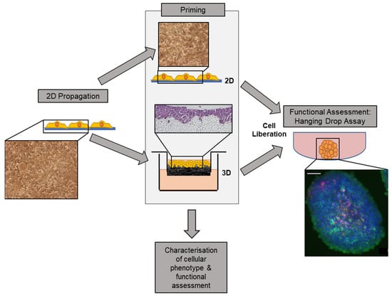 An innovative culture strategy that improves cellular function prior to use in an assay system. HepG2 cells, a well-characterised hepatocarcinoma cell line widely used in drug toxicity testing, was selected as a model cell line. Cells were propagated in traditional 2D culture then seeded onto either a 2D or 3D culture substrate for 8 days in a novel priming step. The 3D culture substrate was an inert porous polystyrene scaffold (Alvetex® Strata), whereas 2D culture substrate was standard culture-ware. Following 8 days of growth on each priming substrate, cells were liberated through trypsinisation and either harvested for analysis and characterisation or re-seeded into a secondary culture system: hanging drop assay, which is a widely used pharmacological assay system.