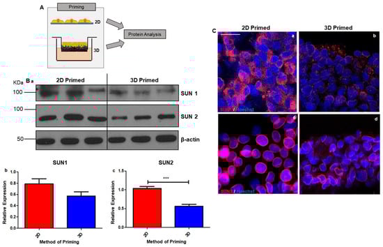 Western blot analysis was carried out on the nuclear structural markers SUN1 and SUN2: components of the linker of nucleoskeleton and cytoskeleton (LINC) complex (Figure 3(Ba)). The expressions of both SUN1 and SUN2 were notably increased in 2D-primed cells and confirmed to be statistically significant through densitometry (Figure 3(Bb,c)).