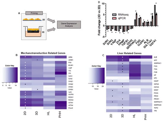 qRT-PCR was used as a method of validation to confirm the RNAseq profiles described above. A set of mechanotransduction-associated and functional genes were selected from the RNAseq data and performed as qRT-PCR analysis (Figure 4D) and expressed as the fold change of 3D- compared to 2D-primed populations. Structural genes involved in the process of mechanotransduction were similarly reduced in 3D-primed populations and functional liver-related gene expression was increased. These data supported the RNAseq findings, ensuring the data presented are reproducible across several analytical techniques.