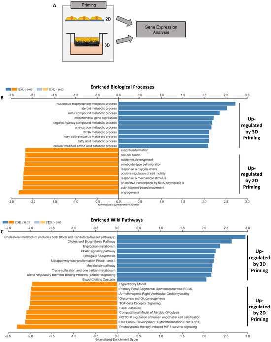 Transcriptomic datasets (Figure 5A) were further analysed using WebGestalt [] to identify enriched biological processes (Figure 5B) and pathways (Figure 5C). These data showed a substantial pattern of metabolic enrichment in the 3D-primed cells, including steroid, fatty acid and amino acid metabolism, specific to liver functions. Additionally, the enrichment of mitochondrial gene expression was tested, indicative of enhanced hepatic capacity, whereas mechanotransduction-linked genes, including response to mechanical stimulus and cell motility, were upregulated in the 2D-primed population.