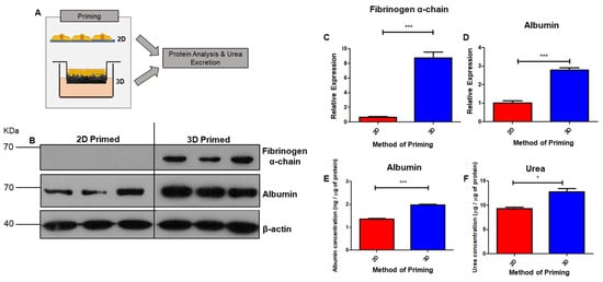Protein analysis was performed to probe for hepatic capability on 2D/3D-cultured HepG2 cells (Figure 6A). Protein expression of albumin and fibrinogen α-chain were measured via Western blotting (Figure 6B), both of which substantially increased in expression in 3D-primed cells. Densitometry confirmed statistical significance in the case of both fibrinogen α-chain (Figure 6C) and albumin (Figure 6D). Production and secretion into the culture medium of both albumin (Figure 6E) and urea (Figure 6F) were measured via ELISA, and urea was significantly enhanced in 3D-primed cultures.