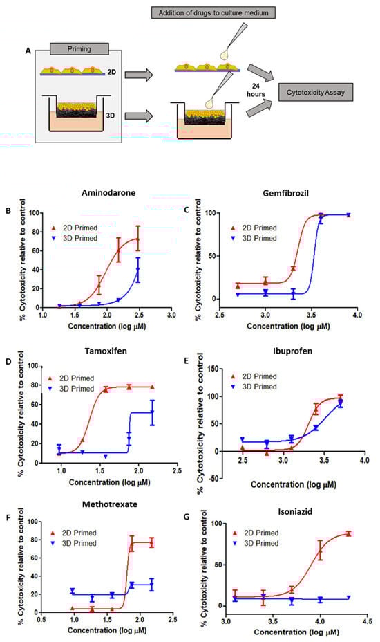 HepG2 cells were primed on 2D/3D surfaces for 8 days prior to the addition of drugs to the culture medium for 24 h before cytotoxicity testing via LDH assay (Figure 7A), from these data, dose–response relationships could be ascertained. Six drugs were selected based on their known toxicity to hepatocytes: Amiodarone (Figure 7B), Gemfibrozil (Figure 7C), Tamoxifen (Figure 7D) and Ibuprofen (Figure 7E), Methotrexate (Figure 7F) and Isoniazid (Figure 7G).