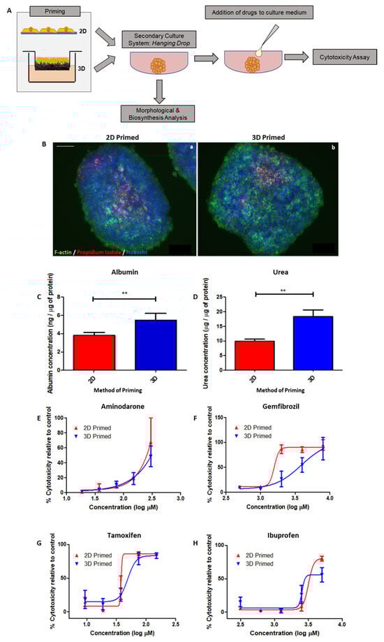 Enhanced functionality of 3D-primed cells in “gold standard” hanging drop assay. Schematic representation of 2D/3D-primed HepG2 cells, re-seeded into a secondary hanging drop culture system to form spheroid structures (A). Hanging drops were either analysed or dosed with drugs to develop drug toxicity profiles. Representative images of spheroids formed from 2D (Ba)- or 3D (Bb)-primed cells. F-actin is stained by phalloidin in green, propidium iodide stains dead cells in red and Hoechst highlights nuclei in blue. Increased production of metabolites, albumin (C) and urea (D) in the medium of 3D-cultured cells measured via ELISA, remained a consistent finding even when cells were in spheroid form. Measured via ELISA of culture medium and normalised to total protein (data represent mean ± SEM, n = 24). Spheroids were exposed to increasing concentrations of Amiodarone (E), Gemfibrozil (F), Tamoxifen (G) and Ibuprofen (H) (data represent mean ± SEM, n = 8). Drug toxicity curves were determined from an LDH assay of the culture medium. Scale bars: 100 µm. ** = p < 0.001.