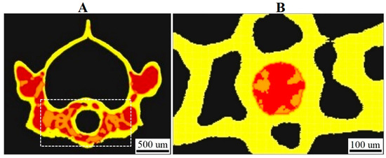 Transverse CT sections of the gecko’s caudal vertebra: (A) the segmented cortical bone (Ct.B), yellow; the subcortical volume (Sc.V), red; the ROI in the ventral side of the vertebra segmented for trabecular parameter (Tb.Th, Tb.Sp, Tb.N) calculation, marked by a dotted rectangle; (B) the ROI (TV) for segmentation and calculation of the septum mineralized cartilage volume (Sept.MCV) in the notochordal canal of the vertebra, red.