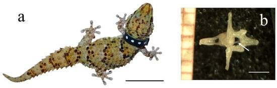 (a) A thick-toed gecko that participated in the orbital experiment; (b) posterior view of the gecko’s vertebra with the transverse processes, haemal arch, and clearly visible vertebral canal (white arrow). Scale bar (a) 3 cm, (b) 1.8 mm.