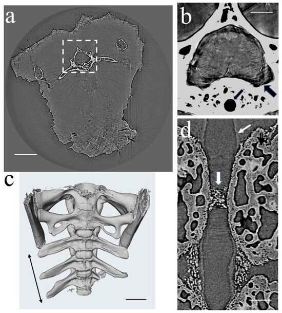 The image shown in Figure 4a illustrates the tomographic slice of the entire TG sample (transverse section); the magnified view of the region boxed in Figure 4a is shown in Figure 4b (the vertebral and notochordal canals are indicated by thick and thin black arrows in the figure). XPCT imaging enables the observation of both calcified and soft tissues, as illustrated in Figure 3a,b, highlighting the skeletal structure, muscular system, and central nervous system.