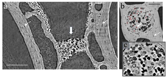 Our XPCT study, which is consistent with our histological results shown in Figure 3 and the results published in Ref. [35], suggests that the notochord is composed of chordoid tissue periodically separated by chondroid tissue with non-vacuolated oval-shaped cells and considerable amounts of extracellular matrix (see Figure 5). Chondroid tissue does not contain blood vessels, nerves, or lymphatic vessels. Additionally, it undergoes mineralization in the mid-vertebral areas, which corresponds to a reduction in notochord diameters (see the longitudinal section of a vertebra with notochordal canal and notochord in Figure 5a). The images in Figure 5b,c highlight the mineralized notochordal cartilage in a transversal section of the sample at the mid-vertebral regions. The white arrow in Figure 5b indicates chondrocytes, and red dots show chondrocyte nuclei. Figure 5c illustrates the zoomed image of the mineralized septum.