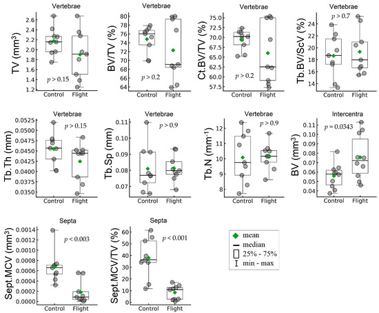 After the experiment, no significant differences were found for the parameters of trabeculae, including trabecular thickness (Tb.Th), trabecular separation (Tb.Sp), and trabecular number (Tb.N) (−6.61%, p > 0.15; 0.36%, p > 0.9; 0.75%, p > 0.9; respectively). The septal mineralized cartilage volume (Sept.MCV) and septal mineralized cartilage volume fraction (Sept.MCV/TV) of calcified septa in the notochordal canal of the vertebra showed a large reduction (−73.19%, p < 0.003; −77.83%, p < 0.001; respectively) in the flight group vs. the control. On the contrary, a statistically significant increase (+35.73 %, p = 0.0343) in bone volume (BV) was found for the intercentra after the space flight. Since the intercentra consists almost entirely of cortical bone, the bone volume fraction parameters (BV/TV) were not calculated.